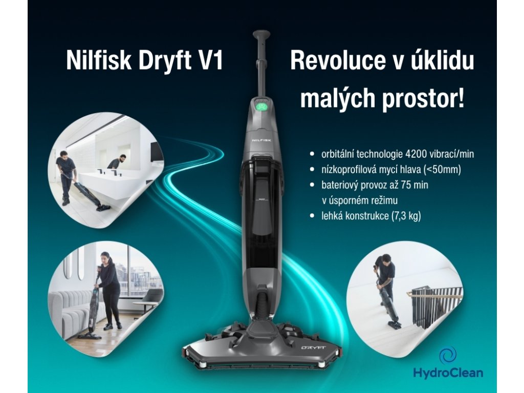 Nilfisk Dryft V1 představuje nový standard v oblasti profesionálního úklidu malých a obtížně přístupných prostor. Tento kompaktní mycí stroj s orbitální hlavou a patentovaným nízkoprofilovým designem spojuje výkonnost profesionálních mycích strojů s obratností ručního nářadí. Výsledkem je efektivní, ergonomické a výrazně hygieničtější řešení než tradiční mopování.