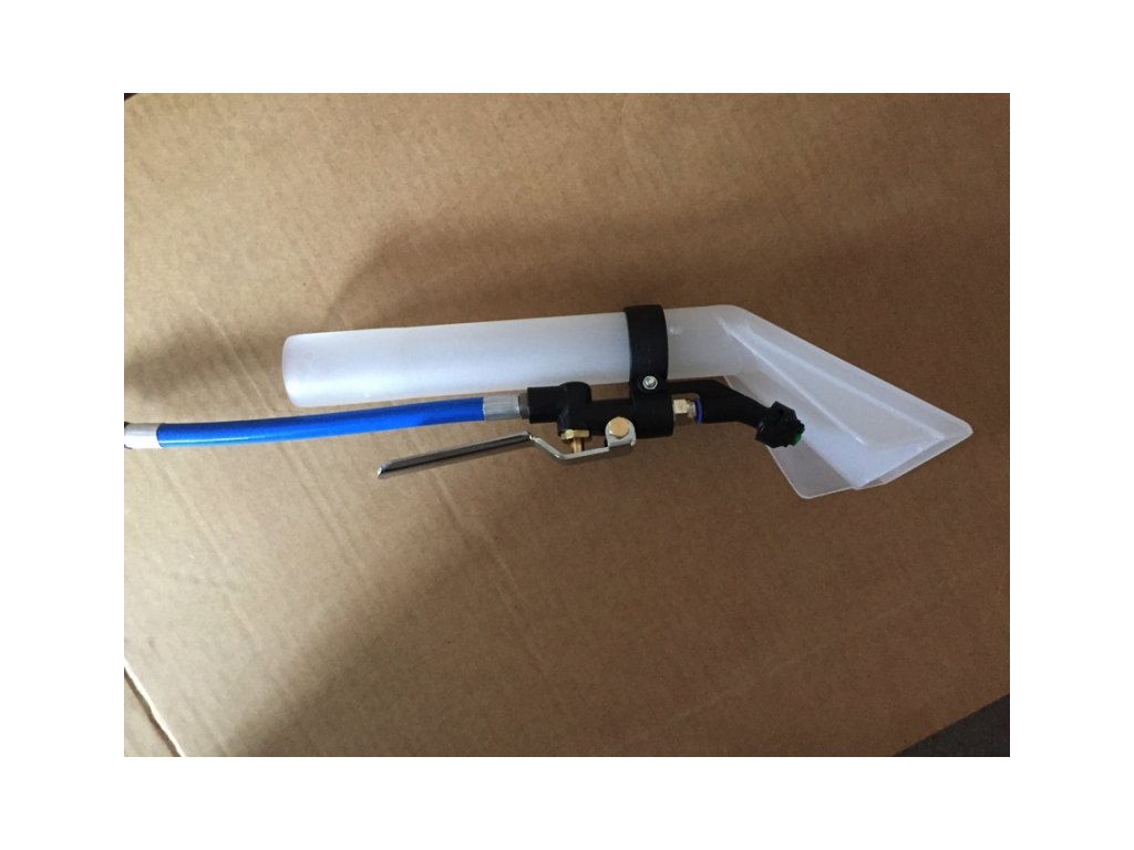 Průhledná plastová ruční hubice Santoemma pro čištění čalounění s jednou tryskou, tato hubice je vybavena kovovým ovladačem ventilu pro spouštění čistícího roztoku. Výhodou je možnost sledování odsávané tekutiny.